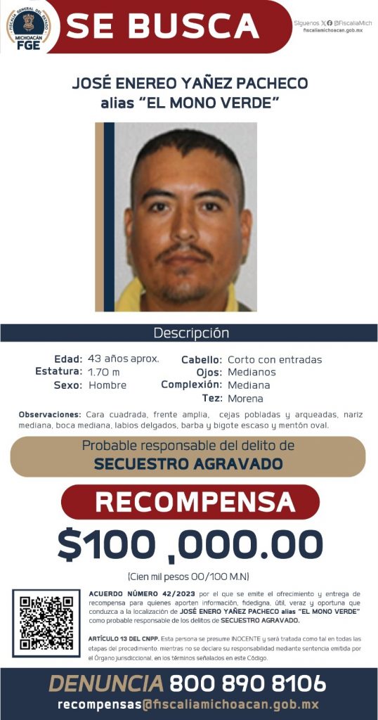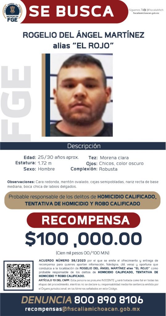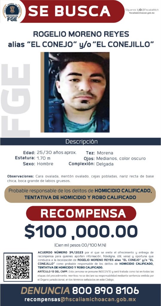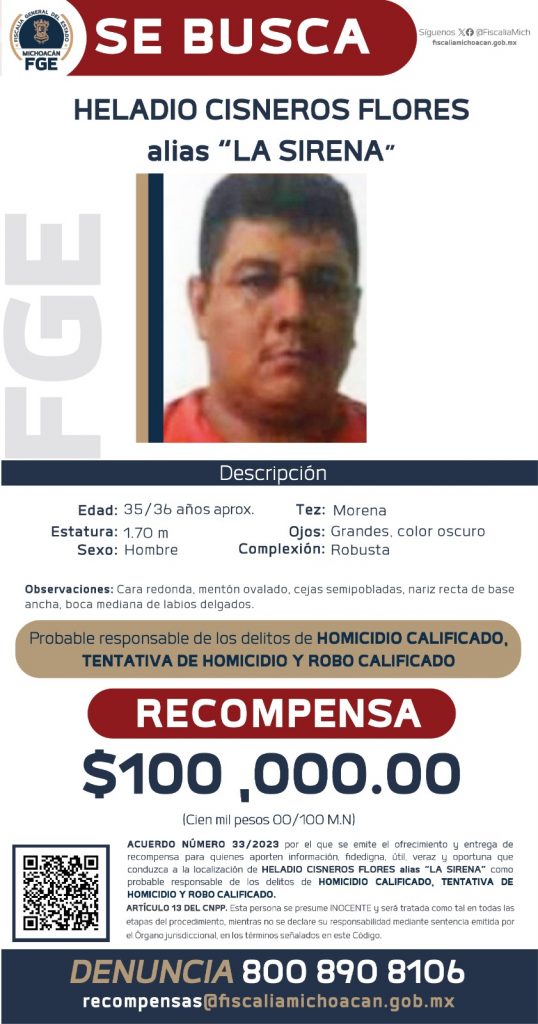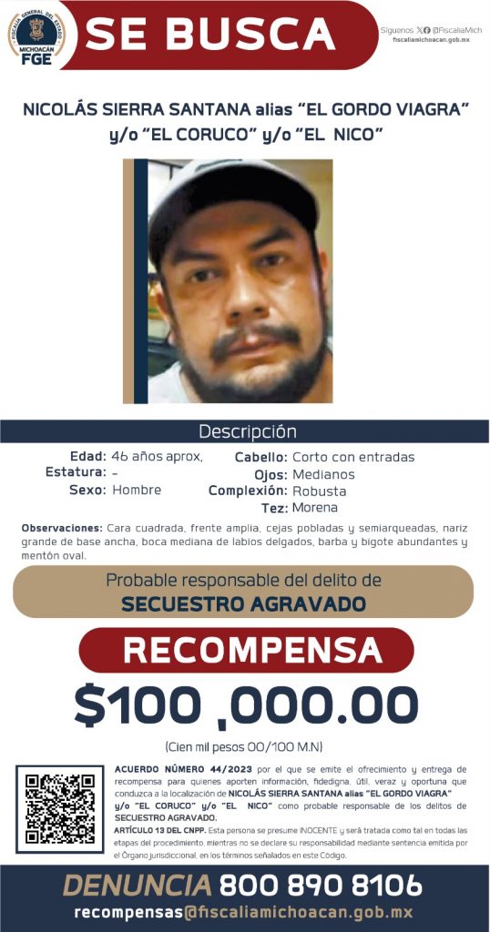 Redacción / La Voz de Michoacán Morelia, Michoacán. La Fiscalía General del Estado de Michoacán (FGE) ofrece una recompensa de 100 mil pesos para quienes aporten información fidedigna, útil y oportuna que conduzca a la localización y detención de 11 personas presuntas integrantes de dos células criminales, de los cuales, cinco están relacionados con el homicidio del exlíder de los autodefensas en Buenavista, Hipólito Mora Chávez. Se trata de Andrés Alejandro Sepúlveda Álvarez, “Jando y/o El Fresa”, César Alejandro Sepúlveda Arellano, “El Boto y/o El Botox” Nicolás Sierra Santana, “El Gordo Viagra y/o El Coruco”, Gabino Sierra Santana, “El Ingeniero”, Mario Álvarez Espinoza “El Metro” y José Enereo Yáñez Pachecho, “El Mono Verde”, así como Heladio Cisneros Reyes, “La Sirena”, Rogelio Del Ángel Martínez, “El Rojo”, Roberto Cabrera González, alias “El Betillo y/o El Taquero”, Rogelio Moreno Reyes, “El Conejo y/o Conejillo” y Brayan Quintero Equihua, éstos últimos se encuentran relacionados en el homicidio del exlíder de autodefensas, Hipólito Mora Chávez, ocurrido el pasado 29 de junio, en La Ruana, municipio de Buenavista. En atención a ello y de conformidad con las atribuciones que le confiere la Ley Orgánica de la Fiscalía General del Estado de Michoacán para el Ofrecimiento y Entrega de Recompensas, el Fiscal General Adrián López Solís, firmó los acuerdos 33/2023, 36/2023, 37/2023, 38/2023, 39/2023, 40/2023, 41/2023, 42/2023, 43/2023, 44/2023 y 45/2023 de ofrecimiento y entrega de recompensa para la localización y detención de los antes señalados. El monto de recompensa ofrecida es de 100 mil pesos y no será aplicable a las personas servidoras públicas con funciones relacionadas con las instituciones policiales, de procuración y administración de justicia, del sistema penitenciario y dependencias encargadas de la seguridad pública a nivel federal, estatal y municipal, así como sus cónyuges o parientes consanguíneos hasta cuarto grado, por afinidad o civiles. La información que aporten los particulares será recibida en la Agencia de Inteligencia Criminal de la Fiscalía General del Estado de Michoacán, con domicilio en Periférico Independencia, número 5000, colonia Sentimientos de la Nación, C.P. 58170, Morelia, Michoacán; a la dirección de correo electrónico recompensas@fiscaliamichoacan.gob.mx; y, al número telefónico 800 890 81 06 de cualquier parte del país.