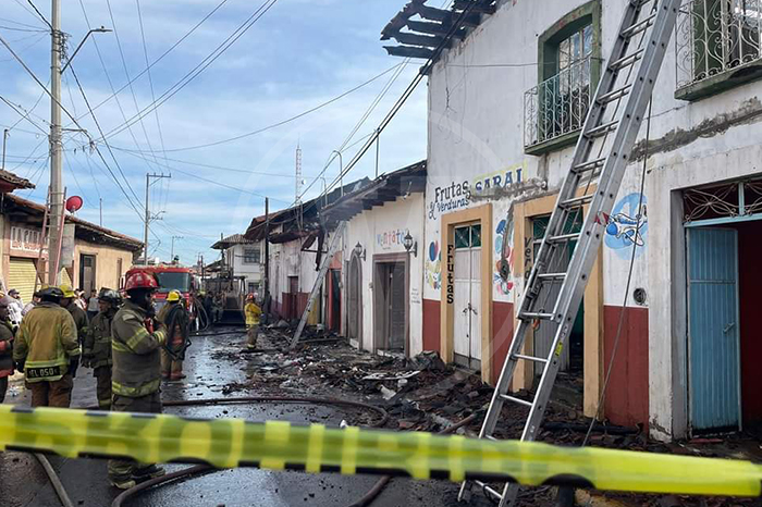 Redacción / La Voz de Michoacán Taretan, Michoacán. Un total de seis antiquísimas viviendas, con sus respectivos locales comerciales al frente, fueron consumidos por el fuego, la tarde de este sábado, en el primer cuadro de esta localidad de Taretan, donde una persona sufrió quemaduras de primer grado. Ante la emergencia, se registró una intensa movilización, en apoyo para sofocar las llamas que amenazaban a otros domicilios; acudiendo Bomberos de Taretan, del Ingenio de Azúcar “Lázaro Cárdenas”, Policía Municipal, y el apoyo del Cuerpo de Rescate, Bomberos Profesionales, Voluntarios de Uruapan, Capasu, Bomberos y Protección Civil de Pátzcuaro, Protección Civil y Tránsito del Estado, además de un ejército de civiles voluntarios. Foto: La Voz de Michoacán. Poco antes de las dos de la tarde, se dio la voz de alerta; había grandes llamas que habrían comenzado por una fuga de gas, en un local de venta de comida en la calle Revolución. A pesar de la dimensión del incendio, solamente un voluntario sufrió quemaduras de primer grado; las pérdidas materiales, fueron cuantiosas. Algunos de los domicilios, de las familias, García y otra, la Trigueros. Tres horas después, estaba controlada la quemazón.
