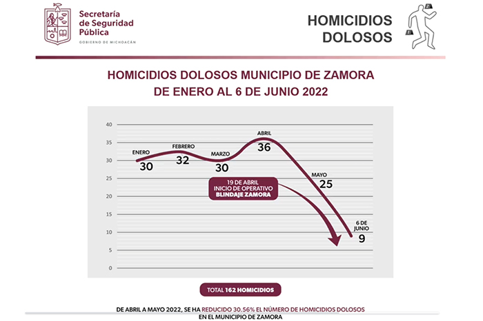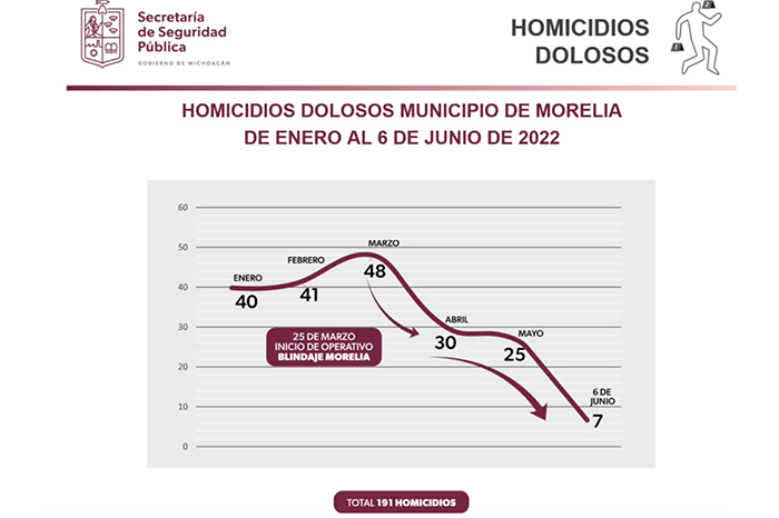 Redacción / La Voz de Michoacán Morelia, Michoacán. Gracias al operativo blindaje que la Secretaría de Seguridad Pública de Michoacán ha implementado en Morelia y Zamora, los homicidios dolosos han disminuido, destacó el General José Alfredo Ortega Reyes. El titular de la SSP de Michoacán detalló que en marzo, la capital michoacana registró el pico más alto en cuanto a asesinatos, con 48, y desde el día 25 de ese mes, cuando se puso en marcha la estrategia, se ha registrado una disminución en este delito, al reportarse en 30 en abril, 25 en mayo y 7 hasta el 6 de junio. Además, ponderó que se han puesto a disposición de la autoridad correspondiente a mil 767 personas durante este periodo: 218 ante FGE, 18 ante la FGR, una ante el CEJIM, 10 ante la FGE con mandamiento vigente y mil 519 han sido remitidas a barandilla. Otros resultados del operativo, de acuerdo con Ortega Reyes, son el aseguramiento de 10 armas cortas, 6 largas, 5 cargadores, 434 cartuchos, 25 armas blancas y 19 réplicas de armas. Respecto a estupefacientes, se decomisaron poco más de 8 kilos de metanfetamina (crystal), 111 pastillas de clonazepam, 17 kilos de marihuana, 6 gramos de heroína, 94 gramos de cocaína y 10 mililitros de clonazepam líquido. En cuanto el impacto económico, las 8 mil 183 dosis de cristal equivalen a 2 millones 45 mil 750 pesos; las 176.06 dosis de marihuana a 61 mil 621 pesos, y las 94 dosis de cocaína a 47 mil pesos. Por su parte, con las acciones emprendidas en Zamora del 19 de abril al 6 de junio, el delito de homicidio doloso pasó de 36 en el mes de inicio, que registró el mayor número, a 9 hasta el 6 de junio, registrándose 30 en marzo y 25 en mayo. En cuanto a personas puestas a disposición, son 92 ante la FGE, 13 aseguradas y remitidas a la FGE con mandato vigente, 8 a la FGR y mil 239 a barandilla, para un total de mil 552. Asimismo, del 19 de abril al 6 de junio se incautaron 5 kilos 490 gramos de matenfetamina (crystal en pequeñas dosis), 20 kilos 96 gramos de marihuana (en pequeñas dosis) y 198 pastillas de clonazepam. Y el impacto económico al tráfico de estas sustancias ilícitas equivale a un millón 372 mil 500 pesos respecto a las dosis de crystal y 70 mil 336 pesos en las 200.96 dosis de marihuana. El General reconoció al Ejército Mexicano y la Guardia Nacional, instituciones con las que se han realizado todos los operativos no solamente terrestres, también a través de acciones “aeromóviles” que han permitido, por ejemplo en Zamora, la captura de bandas delictivas en un solo evento.