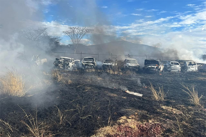 Redacción / La Voz de Michoacán La Piedad, Michoacán. Un incendio de pastizal alcanzó el corralón de "Grúas Zamoranas" ubicado sobre la carretera La Piedad -Guadalajara, dejando al menos 27 vehículos calcinados. De acuerdo con fuentes de rescate, el siniestró se registró la tarde de ayer en un terreno lleno de maleza seca a un costado del tramo La Piedad – Yurécuaro, sin embargo, las llamas raídamente se extendieron hacia las instalaciones del depósito de vehículos. Bomberos locales al enterarse de la emergencia se movilizaron al área y con chorros de agua a presión combatieron el fuego, que alcanzó a consumir por lo menos 27 unidades, sin que se reportaran personas heridas. Los vulcanos realizaron labores de enfriamiento y remoción de escombros para evitar que la quemazón se reavivará. Hasta el momento se ignora como comenzó el incendio.