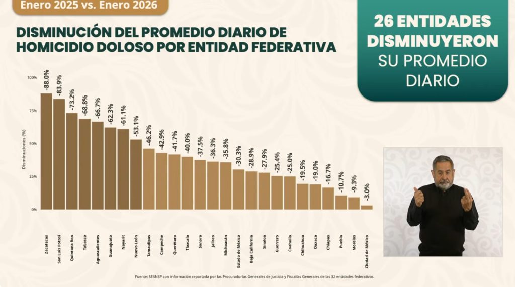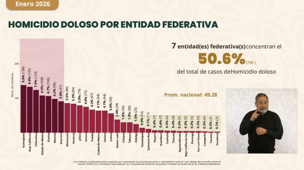 La titular del SESNSP, durante la “mañanera del pueblo” de la presidenta de México, Claudia Sheinbaum Pardo, también destacó que Michoacán se encuentra entre las 26 entidades que registran una disminución en el promedio diario, al comparar enero de 2025 con enero de 2026.