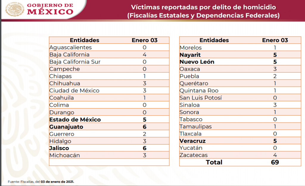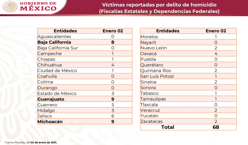 Redacción / La Voz de Michoacán Morelia, Michoacán. La ola de violencia no se detiene en Michoacán y al menos 23 personas han sido asesinadas en lo que va del mes de enero de 2021. De acuerdo con el informe de seguridad del gobierno federal, en la entidad fueron asesinadas 15 personas en los tres primeros días del mes y este lunes [4 de enero], hasta las 16 horas, se han sumado 8 homicidios, 3 de ellos en Uruapan, 2 en Zamora, 2 más en Morelia y uno en Tangamandapio. Zamora es el municipio más azotado por este flagelo: en 2019 tenía 184 homicidios, en 2020 cerca de los 400 y en tan sólo 4 días de 2021, 6 personas han sido asesinadas. El pasado 16 de diciembre del año pasado, el gobernador de Michoacán, Silvano Aureoles, dio a conocer que el delito de homicidios es el “talón de Aquiles” del estado porque se ha duplicado en los últimos años. Ese día, el mandatario estatal reconoció que los homicidios siguen siendo el tema más complejo por la disputa de grupos criminales atribuyó el alza en este crimen a la disputa entre bandas por el dominio de territorios y también por el consumo y venta de drogas. 1 DE ENERO Ese día, el cuerpo desmembrado de un hombre fue localizado en distintas partes de la colonia Jardines de Santiaguito, en el municipio de Morelia. De acuerdo a vecinos, ellos vieron que unos perros merodeaban junto a un inmueble en obra negra en la calle Jardín de Maravillas y se acercaron a ver de qué se trataba, tras lo cual descubrieron que eran restos humanos y lo denunciaron ante las autoridades. En el sitio se constituyeron elementos de la Policía Michoacán quienes confirmaron el hallazgo de un cuerpo humano y acordonaron ese primer sitio. En Zamora, un hombre quedó sin vida dentro de su domicilio tras haber sido atacado a balazos por dos sujetos desconocidos, los cuales, una vez cometido el crimen, se dieron a la fuga a bordo de una motocicleta de color blanco, según informaron las autoridades. La zona fue resguardada por los uniformados, mientas que los paramédicos de Rescate y Salvamento confirmaron el deceso de Víctor Mario G.M., alias "El Osama", de 34 años de edad, el cual presentaba una herida a la altura del tórax en el lado derecho. Expertos de la Fiscalía General del Estado se dieron cita al lugar para procesar la escena del crimen, embalando cinco casquillos percutidos calibre 40 milímetros, y por último llevaron el cadáver a la morgue del Semefo local e integraron la carpeta de investigación. Ese mismo día, los cadáveres de dos presuntos integrantes de un grupo delincuencial fueron localizados en un narcocampamento; ambos estaban en avanzado estado de putrefacción y están sin identificar. El hallazgo de los cuerpos, los cuales presentaban huellas de violencia, se registró en el predio La Higuerilla, ubicado en la comunidad de Sauz de Magaña, en este municipio de Zamora, zona que fue acordonada por los elementos de la Policía Municipal. 2 DE ENERO El pasado 2 de enero, Michoacán reportó 9 personas asesinadas Al mediodía del sábado fue localizado el cuerpo sin vida de una persona del sexo masculino, el cual estaba maniatado y presentaba huellas de tortura. El hallazgo se registró en la calle Puebla esquina con la calle Valle de los Jardines, de la colonia Valle de las Flores, aledaña a la colonia Puerto de Buenavista, al oriente de la capital del estado. Al sitio acudieron elementos de la Secretaría de Seguridad Pública y de la Policía Municipal, así como de la Fiscalía General del Estado, a efecto de acordonar la zona para buscar indicios, luego de lo cual el cadáver, que hasta el momento no ha sido identificado, fue trasladado al servicio médico forense para practicarle la autopsia. Asimismo, ese día un hombre muerto y otro malherido por impactos de bala fueron hallados tirados en una cancha de futbol en la población de Valle Verde, ubicada en este municipio de Zitácuaro. El acontecimiento fue reportado a la Policía por los vecinos de la zona. Los elementos de Seguridad Pública y los rescatistas del Heroico Cuerpo de Bomberos 3 DE ENERO El pasado 3 de enero y de acuerdo a reportes de la Fiscalía, 3 personas fueron asesinadas en diversos hechos. En uno de los casos, un hombre fue asesinado a balazos dentro de su domicilio en la tenencia de Ario de Rayón, ubicada en esta demarcación de Zamora. De los responsables se ignora mayor información y el caso ya es indagado por la Fiscalía General del Estado. Lo anterior se registró la tarde de este domingo, cuando la víctima se encontraba dentro de su hogar localizado en la calle José Sixto Verduzco, del Fraccionamiento Nuevo hasta donde arribaron los delincuentes y le dispararon para enseguida huir. Asimismo, un transeúnte fue ultimado a balazos en la vía pública de la colonia Mariano Escobedo, en la ciudad de Morelia. El móvil del homicidio es desconocido, así como la identidad del interfecto, comentaron las autoridades policiales. Trascendió que durante la tarde de este domingo se escucharon varias detonaciones de arma de fuego sobre la avenida Manuel Ocaranza, casi esquina con la calle Ramón Sánchez y en las inmediaciones del Boulevard De Las Primaveras. 4 DE ENERO Tan sólo este 4 de enero y hasta las 16 horas, 8 personas han sido asesinadas en Michoacán, 3 de ellas en Uruapan, 2 en Zamora, 2 más en Morelia y una en Tangamandapio. En el primero de los casos, la madrugada de este lunes fue reportado el hallazgo de los cadáveres de dos mujeres que estaban maniatadas y baleadas, mismos que fueron encontrados tirados en las calles de la colonia Valle de las Delicias, ubicada en esta ciudad de Uruapan, asunto que es investigado por el personal de la Fiscalía General del Estado (FGE) de Michoacán. El acontecimiento fue reportado por los vecinos de la zona, mismos que comentaron a la Policía que se dirigían a sus hogares cuando hallaron a las fallecidas en la calle Efrén Capiz, muy cerca del Viaducto a Jicalán. El perímetro fue acordonado 