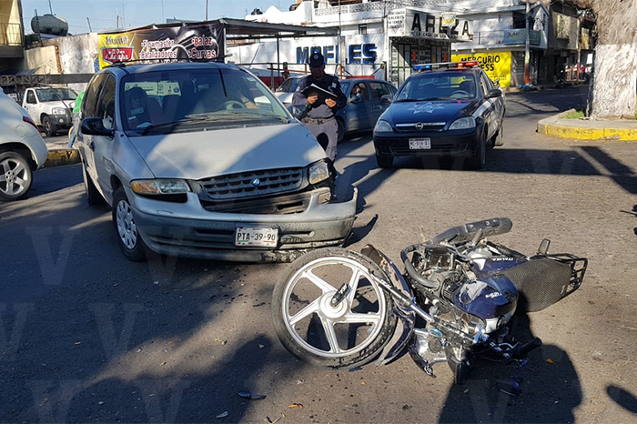 Salvador Rodríguez/La Voz de Michoacán Zamora, Michoacán. Un motociclista quedó lesionado después de que su unidad protagonizó un choque contra una camioneta en esta ciudad de Zamora, según los datos obtenidos por este medio. El suceso fue este viernes en la esquina de la Avenida Juárez con la calle Francisco Villa en la colonia Ejidal Sur, a donde se trasladaron los paramédicos de Rescate y Salvamento para auxiliar al herido. El paciente se identificó como Juan Carlos G., de 19 años de edad, residente de la Tenencia de Ario de Rayón, ubicada en este municipio; persona que fue canalizada al hospital local del Instituto Mexicano del Seguro Social. El muchacho pilotaba una moto de la marca Italika, de color azul marino, sin placas de circulación. La camioneta implicada en el percance es una Chrysler Grand Voyager, de color plata, con matrícula de esta entidad federativa, la cual era conducida por un hombre de la tercera edad. El automovilista también fue hospitalizado, ya que sufrió una crisis nerviosa, su situación legal será definida conforme a Derecho por las autoridades ministeriales.