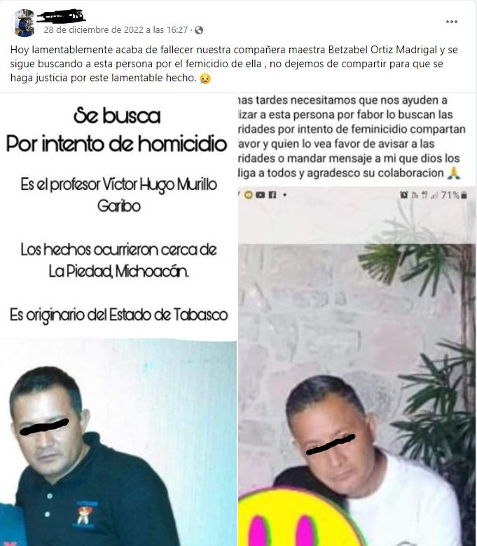 Omar Cuiriz / La Voz de Michoacán Morelia, Michoacán.- El municipio de La Piedad, Michoacán, está conmocionado por el asesinato de Betzabel Ortiz Madrigal, maestra de universidad de apenas 34 años, quien el pasado 13 de diciembre se dirigía a su trabajo cuando fue atacada en la comunidad de Rancho Nuevo, en el municipio de Degollado, Jalisco. Betzabel lamentablemente falleció el pasado miércoles 28 de diciembre, días en un hospital de Morelia, Michoacán, lugar al que fue trasladada para su atención. Su estado de salud siempre fue crítico. La profesora daba clases a niños de cuarto, quinto y sexto grado en la Primaria Plan de Ayala. Ese día se dirigía a su trabajo cuando fue interceptada por un hombre sobre la calle Ruiz Ángel, quien la atacó con un cuchillo varias veces, a unos cuantos metros de su escuela. Los vecinos se percataron del ataque al escuchar los gritos y alertaron a las autoridades, mismas que al llegar encontraron a la maestra en el suelo. Los paramédicos trasladaron al Hospital Regional de La Piedad, en Michoacán, a 19 kilómetros de distancia, pero al requerir atención especializada fue enviada a Morelia. Familiares y amigos, han señalado al exesposo de la víctima Víctor Hugo Murillo Garibo como el responsable de la agresión, quien presuntamente es catedrático universitario y originario del estado de Tabasco. El comité ejecutivo de la sección 16 del Sindicato Nacional de Trabajadores del Estado (SNTE) condenó el feminicidio y exigió el esclarecimiento del caso. "Condenamos enérgicamente el crimen cometido en contra de nuestra compañera. Exigimos su esclarecimiento y que se atienda con perspectiva de género", sentenció el SNTE en un comunicado. Betzabel dejó a dos hijos, una niña de 11 años y un niño de 8 años de edad.