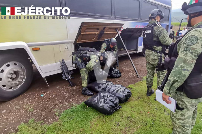 Redacción / La Voz de Michoacán Apatzingán, Michoacán. Un total de 83 mil pesos en droga sintética conocida como "crystal" fueron asegurados por el Ejército Mexicano y la Guardia Nacional en el portaequipaje de un camión turístico con logotipos de un partido político, según la información brindada por contactos oficiales a esta redacción. De acuerdo con el parte de las autoridades, fueron 280 kilos de la droga los cuales estaban depositados en varias bolsas de plástico transparente listas para su venta y distribución en el mercado de las drogas ilegales. El "cristal" que ya estaba empaquetado por kilos a su vez estaba depositado en bolsas grandes de plástico de color negro de las usadas para tirar la basura. La droga era transportada en el maletero de un autobús de turismo con placas de circulación 211RL2, con logotipos del partido Morena, el cual fue interceptado por los guardianes del orden en la carretera Apatzingán-Buenavista, a la altura de la localidad de San Juan de los Plátanos, ubicada en este municipio de Apatzingán. Con relación al tema, la Secretaría de la Defensa Nacional publicó lo siguiente en su cuenta oficial de Twitter (@SEDENAmx):"#EjércitoMexicano y la GN aseguran posible cristal en el estado de Michoacán. Se aseguraron 280 Kilogramos aproximadamente de sustancia granulada aparentemente cristal. El precio estimado de la droga es superior a los $83’000,000.00", divulgó la institución.