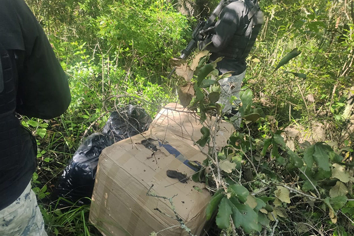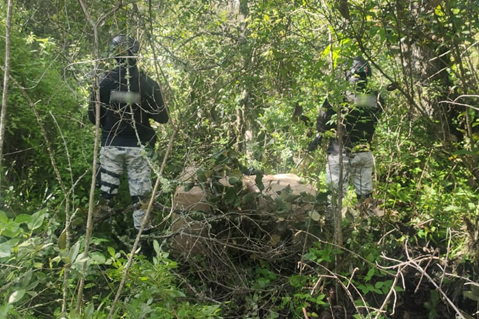 Fue entonces que los guardias nacionales realizaron una inspección en la zona, localizando dos cajas de cartón y dos bolsas de plástico color negro, las cuales estaban ocultas entre matorrales y encontraron alrededor de 84 paquetes que contenían hierba verde y seca con las características propias de la marihuana.