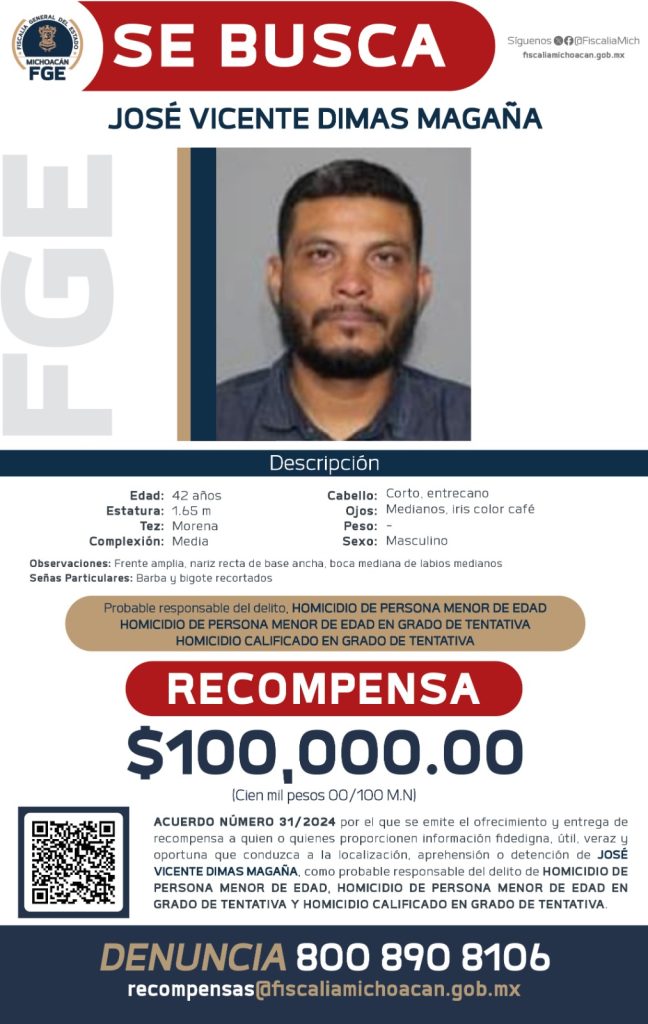 Redacción / La Voz de Michoacán Morelia, Michoacán. La Fiscalía General del Estado de Michoacán (FGE) expidió el acuerdo por el que se emite el ofrecimiento y entrega de recompensa para quienes aporten información fidedigna, útil y oportuna que conduzca a la localización y detención de José Vicente Dimas Magaña, por su posible relación en el homicidio de una niña de 2 años y tentativa de homicidio del padre y de una adolescente de 14 años, hermana de la víctima; hechos ocurridos el pasado 27 de octubre en el municipio de Tarímbaro. De acuerdo con los datos de prueba recabados durante las diligencias, se pudo establecer que el día en referencia, Christian Iván P., se dirigía, junto con sus hijas, de 14 y 2 años de edad, al Instituto de Seguridad y Servicios Sociales de los Trabajadores del Estado (ISSSTE), del municipio de Charo, para encontrarse con su madre y abuela de las niñas, quien se encontraba trabajando en dicho hospital. Sin embargo, al ir conduciendo sobre la avenida La Palma del fraccionamiento San José de la Palma, en Tarímbaro, las víctimas fueron alcanzadas por un motociclista que realizó disparos de arma de fuego en su contra, y que le provocaron la muerte a la niña de 2 años, mientras que el padre y su hermana resultaron ilesos. Estos hechos fueron investigados por la Fiscalía Especializada en Feminicidio, que logró establecer la identidad y posible participación de José Vicente Dimas Magaña en los delitos de homicidio en persona menor de edad, tentativa de homicidio en persona menor de edad y tentativa de homicidio calificado. Otra persona relacionada den el hecho, ya fue detenida y se encuentra vinculada a proceso. Por lo anterior, y de conformidad con las atribuciones que le confiere la Ley Orgánica de la Fiscalía General del Estado de Michoacán para el Ofrecimiento y Entrega de Recompensas, el maestro Adrián López Solís, Fiscal General, firmó el acuerdo 31/2024 por el que se expide el ofrecimiento y entrega de recompensa para la localización y detención de José Vicente Dimas Magaña. El monto de la recompensa por la información que conduzca a la localización, aprehensión o detención del investigado es de 100 mil pesos. Cabe mencionar que el número confidencial de identificación, los datos personales, así como las actas que se levanten y toda la documentación e información que se genere, se clasificará como estrictamente reservada y confidencial, en términos de los artículos 106, 218 y 251 del Código Nacional de Procedimientos Penales y demás ordenamientos aplicables. Los datos de identificación de José Vicente Dimas Magaña son los siguientes: sexo masculino; edad 42 años; complexión media, estatura de 1.65 metros; tez morena; cabello corto, entrecano; frente amplia; cejas pobladas; ojos medianos, de iris color café; nariz recta, de base ancha; boca mediana, de labios medianos; barba y bigote recortados. La información que aporten los particulares será recibida en la Agencia de Inteligencia Criminal de la Fiscalía General del Estado de Michoacán, con domicilio en Periférico Independencia, número 5000, colonia Sentimientos de la Nación, C.P. 58170, Morelia, Michoacán; a la dirección de correo electrónico recompensas@fiscaliamichoacan.gob.mx; y, al número telefónico 800 890 81 06 de cualquier parte del país. El ofrecimiento y entrega de recompensas no será aplicable a las personas servidoras públicas con funciones relacionadas con las instituciones policiales, de procuración y administración de justicia, del sistema penitenciario y dependencias encargadas de la seguridad pública a nivel federal, local y municipal, así como sus cónyuges o parientes consanguíneos hasta cuarto grado, por afinidad o civiles.