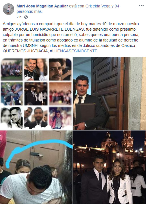 Redacción / La Voz de Michoacán Morelia, Michoacán. Durante la noche de este martes, egresados de la Facultad de Derecho de la UMSNH han utilizado las redes sociales para exigir la liberación de quienes, aseguran, fueron sus compañeros y están acusados de haber perpetrado el asesinato del diputado local Erik Juárez Blanquet, cometido esta mañana. Una usuaria de Facebook identificada como Mari José Magallan Aguilar escribió en la red social: "Amigos ayúdenos a compartir que el día de hoy martes 10 de marzo nuestro amigo JORGE LUIS N, fue detenido como presunto culpable por un homicidio que no cometió, sabes que es una buena persona, en trámites de titulacion como abogado ex alumno de la facultad de derecho de nuestra UMSNH, según los medios es de Jalisco cuando es de Oaxaca. QUEREMOS JUSTIACIA». El otro joven, de nombre David N, es originario de Nueva Italia, Michoacán, y también fue detenido junto a Jorge Luis. Los dos jóvenes están en trámites de titulación en la Facultad de Derecho. Además, durante la cobertura por parte del equipo de La Voz, se detectó que la Policía de Morelia estaba revisando a los peatones que por ahí pasaban y que los jóvenes en ese momento acababan de salir un domicilio, argumentando que ahí vivían, esto mientras los agentes hacían labores de búsqueda por la colonia Industrial, a decir de los vecinos. Hasta el momento la Fiscalía General del Estado no ha emitido información ya que la detención la realizó la Policía Municipal de Morelia y el traslado a la FGE lo realizó la Policía Michoacán. Foto, La Voz de Michoacán. Detención hecha por la Policía de Morelia. La Policía Michoacán trasladó a los detenidos.