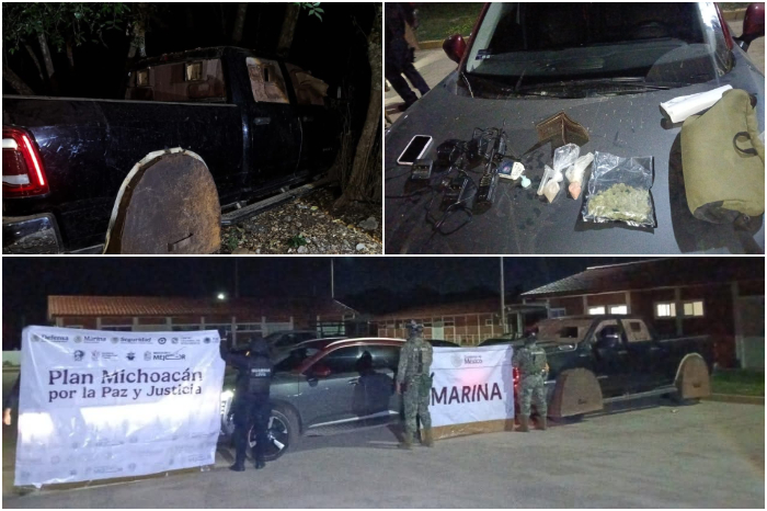 Al aproximarse, los marinos confirmaron que uno de los automotores correspondía a un vehículo tipo “monstruo” con blindaje hechizo, además de un automóvil compacto, dentro de esta última unidad se localizaron dos radios de comunicación y una bolsa con metanfetamina.