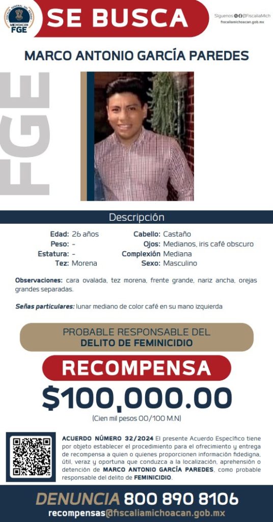 Redacción / La Voz de Michoacán Morelia, Michoacán.- La Fiscalía General del Estado de Michoacán (FGE) expidió el acuerdo, mediante el que se emite el Ofrecimiento y Entrega de Recompensa para quienes aporten información fidedigna, útil y oportuna que conduzca a la localización de Marco Antonio García Paredes, por su posible relación en el delito de feminicidio, perpetrado el pasado 13 de agosto, en agravio de su esposa Marbella H., Derivado de actos de investigación, la FGE obtuvo datos de prueba objetivos y contundentes que señalan la participación directa del antes señalado en los hechos. El día en cita, mientras vacacionaban en el municipio de Salvador Escalante y cuando se encontraban en el domicilio de un familiar de la víctima, Marco Antonio García Paredes atacó con un arma punzocortante a su esposa, provocándole a muerte. Este acto que fue presenciado por los abuelos de la víctima y por la madre del presunto responsable.Por lo anterior y de conformidad con las atribuciones que le confiere la Ley Orgánica de la Fiscalía General del Estado de Michoacán para el Ofrecimiento y Entrega de Recompensas, el maestro Adrián López Solís, Fiscal General, firmó el acuerdo 32/ 2024 de ofrecimiento y entrega de recompensa para la localización y detención de Marco Antonio García Paredes.El monto de la recompensa por la información que conduzca a la localización, aprehensión o detención del investigado es de 100 mil pesos. Cabe mencionar que el número confidencial de identificación, los datos personales, así como las actas que se levanten y toda la documentación e información que se genere, se clasificará como estrictamente reservada y confidencial, en términos de los artículos 106, 218 y 251 del Código Nacional de Procedimientos Penales y demás ordenamientos aplicables. EL ASESINO Los datos de identificación de Marco Antonio García Paredes son: hombre de 26 años de edad; complexión mediana; cara ovalada; tez morena; frente mediana; ojos medianos de iris café obscuro; nariz ancha; orejas grandes separadas y pelo castaño.La información que aporten los particulares será recibida en la Agencia de Inteligencia Criminal de la Fiscalía General del Estado de Michoacán, con domicilio en Periférico Independencia, número 5000, colonia Sentimientos de la Nación, C.P. 58170, Morelia, Michoacán; a la dirección de correo electrónico recompensas@fiscaliamichoacan.gob.mx; y, al número telefónico 800 890 81 06 de cualquier parte del país. El ofrecimiento y entrega de recompensas no será aplicable a las personas servidoras públicas con funciones relacionadas con las instituciones policiales, de procuración y administración de justicia, del sistema penitenciario y dependencias encargadas de la seguridad pública a nivel federal, local y municipal, así como sus cónyuges o parientes consanguíneos hasta cuarto grado, por afinidad o civiles.*