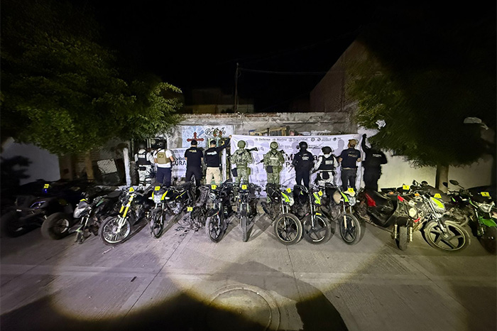 Redacción / La Voz de Michoacán Jacona, Michoacán. En una acción interinstitucional, elementos de las secretarías de Seguridad Pública (SSP) y de la Defensa Nacional (Defensa), así como la Guardia Nacional (GN), dieron acompañamiento a una orden de cateo que cumplimentó la Fiscalía General del Estado (FGE) en un inmueble en Jacona, donde se recuperaron 11 motocicletas robadas. Como parte de las tareas operativas y de inteligencia del Plan Paricutín, en un domicilio ubicado al sur de la demarcación aseguraron las motocicletas, siete de la marca Italika, dos Dinamo, una Veloci y una Suzuki, todas con reporte de robo, mismas que fueron puestas a disposición de la autoridad competente. Las labores del Plan Michoacán por la Paz y la Justicia se refuerzan día con día, para brindar a la ciudadanía la tranquilidad y las condiciones de desarrollo que merecen. La SSP recuerda a la población el servicio de las líneas 911 y 089, así como la app 911 Michoacán, para reportar cualquier delito de forma anónima o solicitar algún servicio de emergencia.
