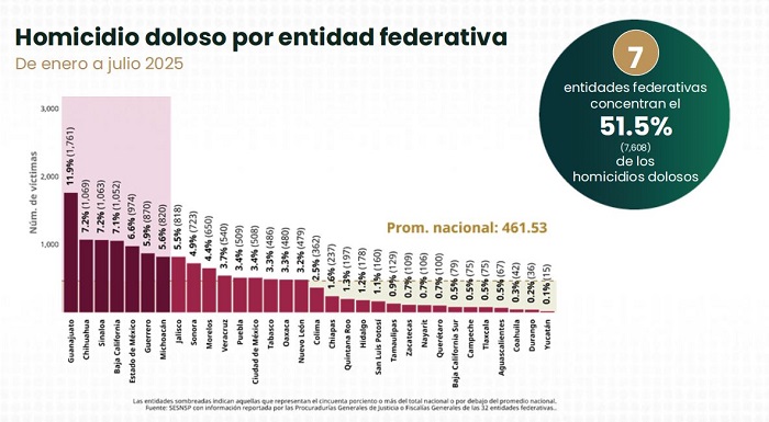 Redacción / La Voz de Michoacán Morelia, Michoacán.- Esta mañana el titular de la Secretaría de Seguridad y Protección Ciudadana (SSPC), Omar García Harfuch, anunció una reducción en la cantidad de homicidios dolosos en el país, destacando las estrategias el gabinete de Seguridad encabezado por la presidenta Claudia Sheinbaum y las Fuerzas Armadas. El secretario destacó que se han implementado estrategias especiales y directas en algunos estados y como resultado ha disminuido la taza del víctimas de homicidio doloso, “como en Baja California que se registró un descenso de 35.8% al comparar julio de 2025 con septiembre de 2024”. En este estado destacó también las detenciones de lideres del cártel del pacífico. Otra entidad es el Estado de México, donde se redujo la cantidad de víctimas un 45% respecto a 2024, “aquí han sido detenidas 71 personas vinculadas con la Familia Michoacana, Cartel Jalisco y Los Alfas”. En Guanajuato se disminuyo 47% respecto a septiembre de 2024 y destacó el aseguramiento de 164 mil litros de hidrocarburo. Así mismo destacó acciones en Nuevo León, Puebla y Tabasco, también con tendencia a la baja. En promedio en todo el territorio mexicano la disminución de las víctimas de asesinato fueron de 25.3%, respecto a septiembre del año pasado, lo que se traduce en 22 homicidios diarios menos, al pasar de 86 a 64 en dicho periodo. Respecto a las entidades federativas que concentran el 51.5 por ciento de los homicidios dolosos, señaló que son siete: Guanajuato: 1,761 víctimas de homicidio dolosoChihuahua: 1,069 víctimas de homicidio dolosoSinaloa: 1, 063 víctimas de homicidio dolosoBaja California: 1,052 víctimas de homicidio dolosoEstado de México: 974 víctimas de homicidio dolosoGuerrero: 870 víctimas de homicidio dolosoMichoacán: 820 víctimas de homicidio doloso
