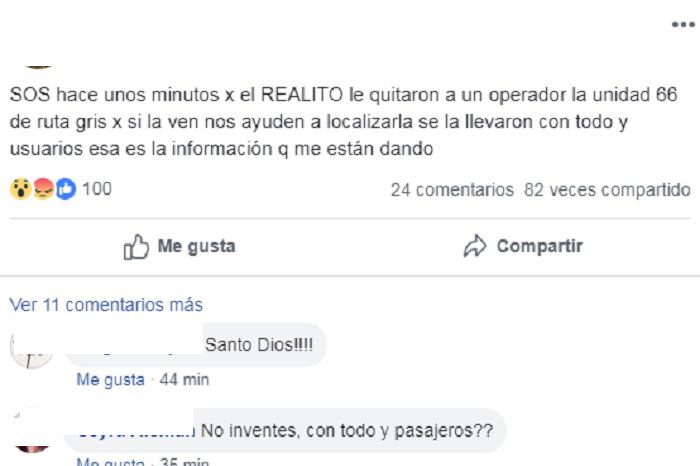 La primera información que circuló en redes sociales comunicaba que la unidad de número 66 de la ruta gris, había sido tomada mientras se encontraban pasajeros dentro de ella, despojando de sus pertenencia a los mismos usuarios, sin embargo, Secretaria de Gobierno del Estado informan que la unidad que fue tomada, efectivamente no tenía pasajeros en ella, el conductor de la unidad fue la única persona agredida.