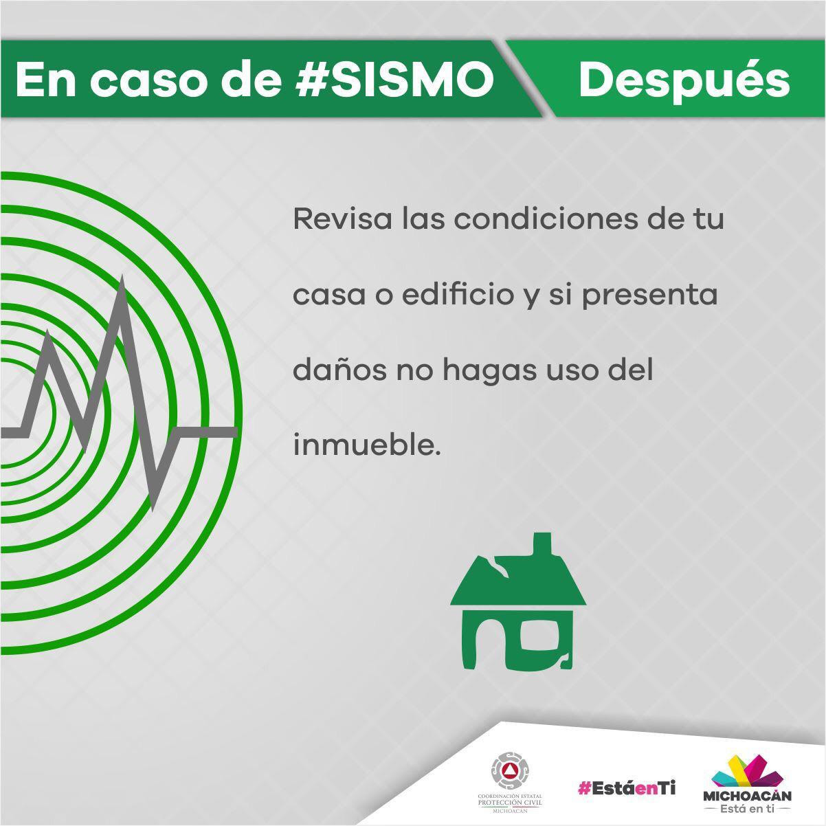 Redacción / La Voz de Michoacán Morelia, Michoacán. La Secretaría de Gobierno, a través de la Coordinación Estatal de Protección Civil hace un llamado a la población a mantenerse informada y preparada en caso de un sismo. Lo anterior tras el registro de un nuevo sismo, perceptible y con epicentro en el estado de Michoacán, así como para fomentar la cultura de la prevención y la protección civil y por consiguiente, dotar a la población michoacana de herramientas de acción y reacción ante un fenómeno de esta naturaleza. En este sentido, se reiteran las siguientes recomendaciones para actuar durante y después de un movimiento telúrico: Mantener la calma, alejarse de ventanas y ubicarse en una zona de seguridad. Después de un sismo, regularmente se presentan réplicas, es importante mantener la calma y estar alerta ante cualquier situación de este tipo. Es fundamental, preparar un plan de protección civil familiar, que contemple la ubicación de zonas de seguridad, participar en simulacros y almacenar alimentos no perecederos y agua potable. Una vez pasado el sismo, se deben revisar los inmuebles para descartar daños en la estructura. Asimismo, evitar encender fuego hasta comprobar que no hay daños en las tuberías de gas. En una situación de desastre, el teléfono sólo debe usarse para emergencias. Mantenerse informado, preferentemente por los medios oficiales, sobre el desarrollo del fenómeno y sus consecuencias.