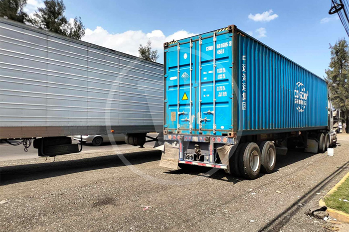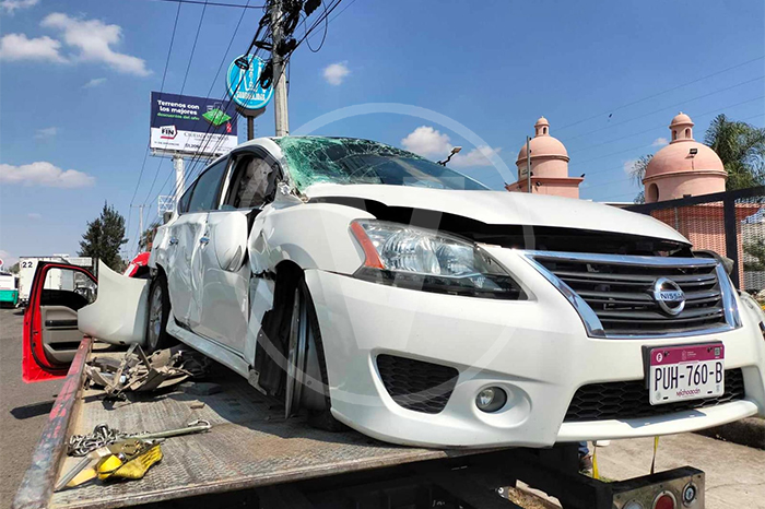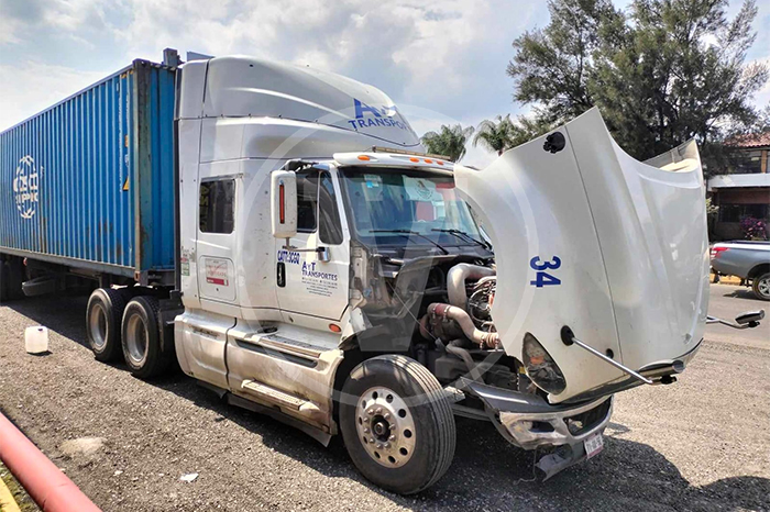Redacción / La Voz de Michoacán Morelia, Michoacán. Un automóvil terminó destrozado tras ser embestido por un tráiler y proyectado contra otro tractocamión en una de las laterales de Calzada La Huerta, salida a Pátzcuaro en la ciudad de Morelia, informaron fuentes policiales y de rescate, las cuales indicaron que el conductor del auto compacto resultó ileso. El accidente se registró la tarde de este miércoles a la altura del fraccionamiento Prados de La Huerta y cerca de la desviación a la Tenencia Morelos. Se apreció que el coche siniestrado es un Nissan Sentra, color blanco, con placa PUH760B; el tráiler que lo impactó en la retaguardia es un International, cabina azul, número económico 34 y matrícula 71AX5C, con la leyenda "AyT Transportes". El otro vehículo indirectamente involucrado es también de la marca International, cabina blanca. Elementos de la Guardia Civil (GC) de Seguridad Vial se encargaron del peritaje correspondiente para deslindar responsabilidades. En las labores de ayuda participaron socorristas de la Coordinación Estatal de Protección Civil Michoacán (CEPCM). Algunos testigos comentaron que el tractocamión azul circulaba a una velocidad mayor de la permitida y en determinado momento se estrelló contra el Sentra, éste dio giros sobre sus neumáticos y chocó contra el otro tractocamión quedando dañado entre ambas unidades de carga pesada.