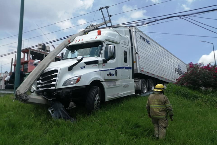Redacción / La Voz de Michoacán Morelia, Michoacán. Un tractocamión chocó contra un poste de concreto que sostenía un transformador de luz de la Comisión Federal de Electricidad (CFE), esto tras salirse de la carpeta asfáltica en la zona oriente de Morelia. Al respecto, las autoridades policiales comentaron que el percance no dejó lesionados, solo daños materiales, pues el citado poste quedó derribado y también una barrera metálica de contención resultó afectada. El incidente sucedió la tarde de este lunes en una de las rampas de la avenida Nicolás Ballesteros, la cual permite incorporarse a la lateral de la avenida Madero Oriente. Como referencia, el hecho tuvo lugar a pocos metros de las colonias Primo Tapia y Bosques de Oriente, en las cercanías del Conalep ubicado en Ciudad Industrial, salida a Charo. Foto: Facebook vía @ProteccionCivilyBomberosMorelia. Se apreció que el tráiler involucrado es uno de color blanco, con número económico 197 y con la leyenda "Fresh Way", cuya cabina terminó atorada en un desnivel. La emergencia fue atendida por elementos de la Policía Municipal, quienes abanderaron el accidente y se encargaron de lo conducente. Cabe recordar que varios vehículos, entre ellos automotores de carga pesada, tomaron vías alternas para llegar a sus destinos, esto debido a que las entradas y salidas de la ciudad de Morelia fueron bloqueadas desde temprana hora por miembros de la Sección XVIII de Coordinadora Nacional de Trabajadores de la Educación (CNTE).