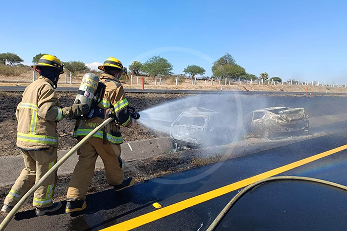 Redacción / La Voz de Michoacán Álvaro Obregón, Michoacán. El pasado lunes se registró el incendio de dos vehículos accidentados en una cuneta de la autopista México-Guadalajara. Recientemente se supo que lo anterior se derivó de un hecho de violencia. De acuerdo con fuentes allegadas a las autoridades policiales, el referido día, un hombre y su compañera de trabajo viajaban a bordo de un auto tipo Versa, color blanco, perteneciente la empresa financiera "Tu solución". Cuando ambas personas circulaban a la altura de la población de Jamaica, Tarímbaro, fueron alcanzadas por sujetos armados en un carro gris, quienes realizaron disparos y les ordenaron detenerse. Ante el temor de resultar heridos, el conductor del Versa aceleró y se dirigió a la autopista, pero él y su colega fueron perseguidos por los agresores, mismos que los chocaron al llegar al kilómetro 235, a la altura de la comunidad de Chehuayo; los automotores cayeron a la cuneta central. Rápidamente, a las víctimas se les acercó uno de los delincuentes y con una pistola le apuntó al conductor del Versa, lo bajó y le preguntó que dónde estaba el dinero, el ofendido le indicó que en la cajuela y se vio obligado a entregarle la cantidad de 10 mil pesos en efectivo. Foto: La Voz de Michoacán. Tras obtener el botín, el empistolado y sus cómplices se llevaron al hombre a bordo de una camioneta. En tanto que la mujer bajó del Versa, caminó algunos metros y pidió ayuda a unos trabajadores de pista, después arribó una ambulancia para atenderla y los automotores comenzaron a quemarse, entonces unos bomberos intervinieron y sofocaron las llamas. La trabajadora relató lo sucedido a los policías, de esa manera la instancia competente emprendió las investigaciones respectivas para esclarecer el caso y dar con el paradero del hombre privado de su libertad, así como de los responsables. Foto: La Voz de Michoacán.
