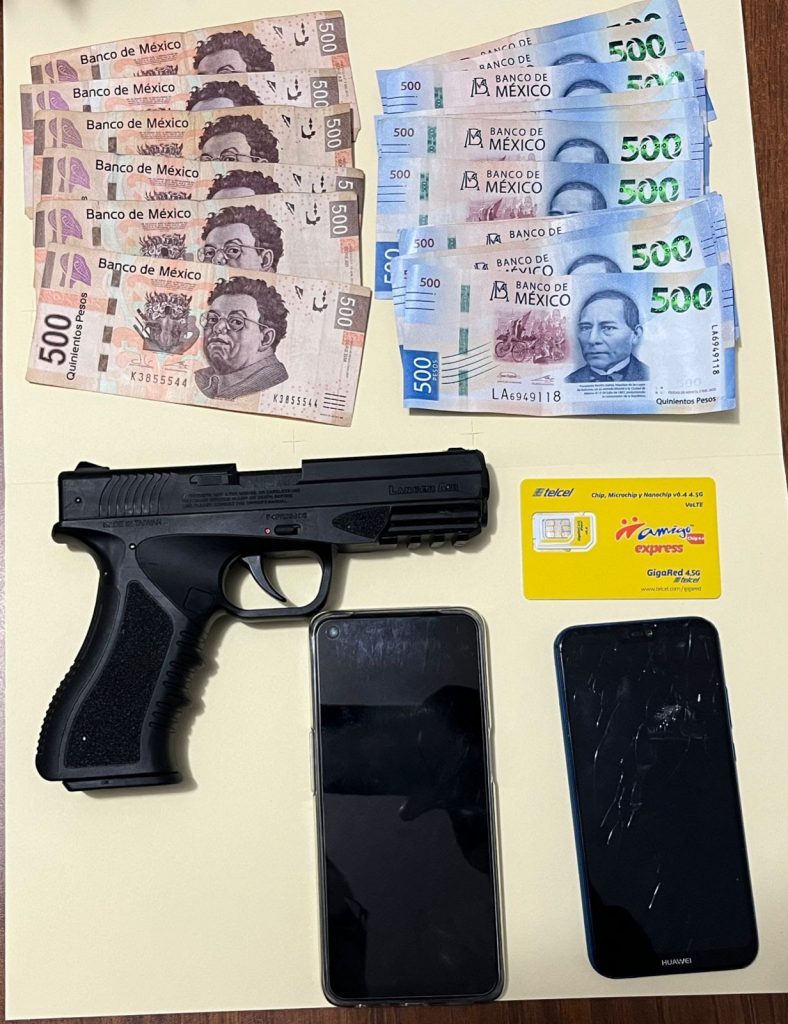 Redacción / La Voz de Michoacán Maravatio, Michoacán. En atención a una denuncia ciudadana, los oficiales de la Secretaría de Seguridad Pública (SSP), lograron detener a dos personas del sexo masculino, presuntamente señaladas por el delito de extorsión; también les fue asegurada la cantidad de 10 mil pesos, una réplica de arma de fuego y teléfonos móviles, hecho registrado en Maravatío. Ambos hombres fueron detenidos por los agentes de la Guardia Civil, en posesión de una réplica de arma de fuego color negro, 10 mil pesos en efectivo. Luego de que unas víctimas denunciaran a las líneas de emergencia. Igualmente, les fueron asegurados teléfonos móviles, presuntamente utilizados para cometer actos de extorsión; por lo que todo lo asegurado y los dos indiciados, fueron trasladados ante la instancia correspondiente, a efecto de llevar a cabo las diligencias establecidas que marca la Ley. La SSP pone a disposición de la ciudadanía, su línea telefónica 911 para denunciar cualquier acto que vulnere su paz, o bien, de manera anónima al 089.