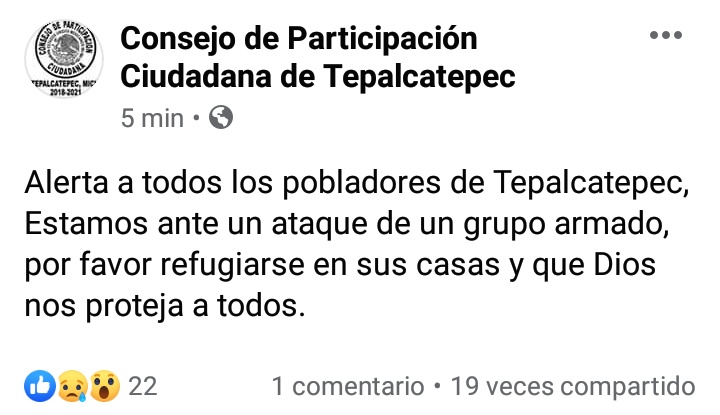 Redacción / La Voz de Michoacán Tepalcatepec. Angustia, miedo, incertidumbre y temor es lo que vivieron habitantes de Tepalcatepec luego del intenso tiroteo que se registró en la noche del sábado y madrugada de este domingo. Alrededor de las 22:30 horas del sábado, usuarios de las redes sociales de Tepalcatepec dieron a conocer que estaban siendo atacados y que se refugiaran en sus casas. Las ráfagas de rifle de grueso calibre alertaron a la población local, siendo identificados los combatientes como integrantes del CJNG que habrían atacado ese territorio en manos del Cártel de Tepalcatepec. Así el mensaje " #TEPALCATEPEC ESTÁ SIENDO ATACADO POR EL CJNG EN ESTOS MOMENTOS, LA BALACERA ESTÁ MUY FUERTE. SI SE NOS VA LA SEÑAL POR FA, AYUDEN A DIFUNDIR ESTE MENSAJE..." Luego, un vídeo donde se escuchan detonaciones pic.twitter.com/Sj6b8PIf6d — Adri Calao (@AdriCalao) July 26, 2020 #Video ?? “Y que Dios nos proteja a todos”. Así se vivió el enfrentamiento durante horas de la noche del sábado entre un convoy de sicarios del Cártel Jalisco Nueva Generación vs pobladores de #Tepalcatepec #Michoacán encabezados por Juan José Farias "El Abuelo" pic.twitter.com/q8HRjLVxTp — CÓDIGO NEGRO MX (@CODIGO_NEGROMX) July 26, 2020 Las balaceras se registraron en La Estanzuela, ubicada al poniente de la cabecera municipal, en los límites de Michoacán con Jalisco.
