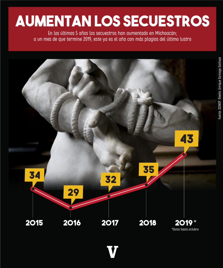 Redacción / La Voz de Michoacán Morelia, Michoacán. En los últimos años el secuestro ha aumentado en Michoacán y aunque todavía falta un mes para que termine, 2019 es ya el año con más casos desde 2015, al registrar 43 víctimas hasta el mes de octubre en todo el estado, cifras que posicionan al estado en el séptimo lugar en todo el país en este flagelo. De acuerdo con el Secretariado Ejecutivo del Sistema Nacional de Seguridad Pública (SESNSP), hasta octubre de este año se registraron 43 secuestros, cifra superior a los casos registrados en todo 2018, que fueron 35; en 2017 fueron 32, en 2016 29 y en 2015 fueron 34. Las entidades con la mayor incidencia de este delito de alto impacto son: Veracruz, con 301 víctimas; Estado de México, con 187; Ciudad de México, 177; Puebla, 78; Morelos, 69; Tamaulipas, 45; Michoacán, con 43, y Guerrero, que registra 41 casos. Apenas ayer un taxista salvó a su sobrino de ser privado de la libertad por tres sujetos que irrumpieron en la vivienda del menor en Morelia y golpearon a su padre para enseguida tratar de llevárselo a la fuerza, pero no lo consiguieron gracias a su familiar y al apoyo de los elementos de la Policía de Morelia. Video: Cortesía. Un taxista evitó que tres sujetos se llevaran ayer a su sobrino de 6 años. Los sujetos se llevaron al menor de 6 años de edad y lo subieron a una camioneta Nissan Frontier de color plata en la que pretendían darse a la fuga. Sin embargo, el tío del menor llegaba al lugar en su vehículo de alquiler y se percató de la situación e impactó la camioneta en la que viajaban los ahora indiciados, quienes fueron detenidos con el apoyo de los oficiales de Seguridad Pública Municipal y quedaron a disposición de la representación social. Foto: La Voz de Michoacán. Tres hombres fueron detenidos ayer, luego de que intentaran privar de la liberad a un menor de edad en Morelia. También esta semana, el pasado lunes, personal de la Fiscalía General del Estado (FGE) de Michoacán (FGE) detuvo a ocho hombres por su posible relación en el delito de secuestro cometido el pasado 13 noviembre el municipio de Ziracuaretiro. Se trata de Efrain P., Christian V., Cristian Jovani R., Gustavo S., Luis Pablo A., Mario G,. Luis Miguel B., y Jesús Alejandro T., de quienes existen datos de prueba de su posible participación en el secuestro de padre e hijo, agricultores del mencionado municipio. El día en cita, los familiares de los agraviados recibieron llamadas telefónicas en las que les informaron del plagio y exigieron la entrega de una importante cantidad de dinero en efectivo, a cambio de respetar la integridad de las víctimas, hechos que de inmediato fueron denunciados ante la Unidad Especializada de Combate al Secuestro (UECS). Personal de la institución implementó una acción operativa sobre la carretera Ziracuaretiro-El Fresno, logrando la detención de los antes señalados, quienes acudieron a bordo de una camioneta GMC, color blanco, a recoger el pago del rescate; ahí les fueron aseguradas dos armas de fuego calibres 5.56 y 7.62 mm, así como tres teléfonos celulares, dos de ellos propiedad de las víctimas, que aún no han sido encontradas. Evitan pago de rescate por casi 3 mdp La Fiscalía General del Estado detuvo en las últimas semanas a nueve personas relacionadas con el delito de secuestro y con ello se evitó que fueran pagados más 2 millones 800 mil pesos por parte de las víctimas de secuestro virtual. El fiscal general del estado, Adrián López Solís, informó que entre 11 y el 17 de noviembre se realizaron nueve detenciones relacionadas con secuestros, seis de ellos en flagrancia y tres por orden de aprehensión. Detalló que se frustraron cuatro secuestros virtuales, evitando con ello el pago de 2 millones 880 mil pesos; en los cuatro temas se advirtió que las llamadas extorsivas se realizaban desde centros penitenciarios, ubicados en otros puntos del país. 2019, récord en secuestros en todo el país A nivel nacional el delito de secuestro se perfila para imponer nuevo récord en este año, así lo anticipan las cifras del SESNSP de los primeros 10 meses de 2019. Entre enero y octubre pasados se registraron mil 392 víctimas de secuestro extorsivo, con calidad de rehén, plagio para causar daño, privación de la libertad exprés y otro tipo de secuestros en todo el país, lo que representa 9% más que en el mismo periodo de 2018, considerado el año más violento, lapso en el que se contabilizaron mil 273 casos. La presidenta de la organización Alto al Secuestro, Isabel Miranda de Wallace señaló que "el más violento fue el año 2014, que fue cuando más plagios se registraron, y después de 2014, este 2019 es uno de los años con más secuestros, así va a cerrar el año por desgracia, ya no se va a revertir la tendencia", afirmó la activista. Miranda de Wallace aseguró que en México se cometen cinco privaciones ilegales de la libertad al día y 35 a la semana. Según estadísticas de Alto al Secuestro, de diciembre de 2018 a septiembre de este año han sido detenidos mil 551 presuntos secuestradores, integrantes de diversas bandas delictivas. La activista Miranda de Wallace señaló que 82% de los secuestros son atendidos por las autoridades estatales, mientras que 18% por las áreas especializadas para este ilícito del gobierno federal, como la Coordinación Nacional Antisecuestro (Conase). El especialista en seguridad, Ricardo Márquez Blas, señaló que el secuestro es otro de los delitos en los que la incidencia de 2019 superará a la registrada durante todo 2018, lo cual, afirmó, es muy preocupante, ya que este ilícito es sumamente doloroso para las víctimas y sus familiares. "Ningún delito debería ir al alza, pero hay algunos cuyo incremento es particularmente preocupante y doloroso. Uno de ellos es el secuestro. El gobierno federal y las administraciones estatales deberían hacer esfuerzos particularmente relevantes y eficientes con relación a e