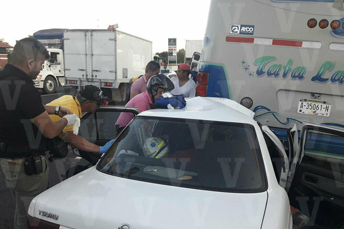 Queda conductor prensado en choque contra camión