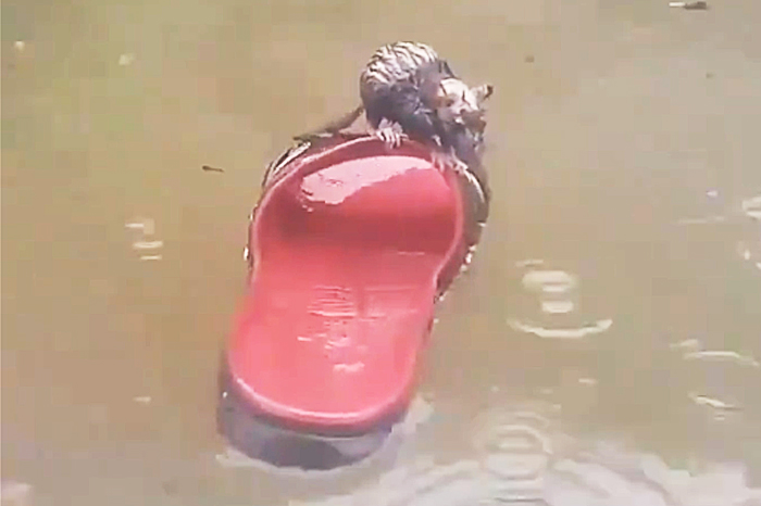 VIDEO | Rata sufre estragos que dejó inundación y una chancleta la salva