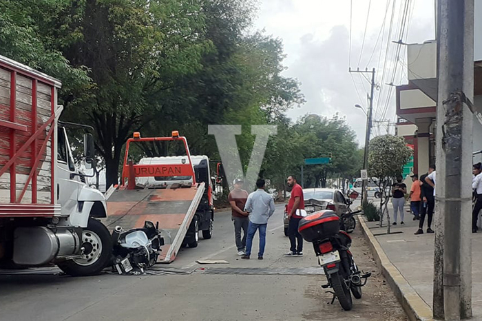 Al circular en una moto, padre e hijo son impactados por un torton y proyectados contra un coche, en Uruapan Leer más »