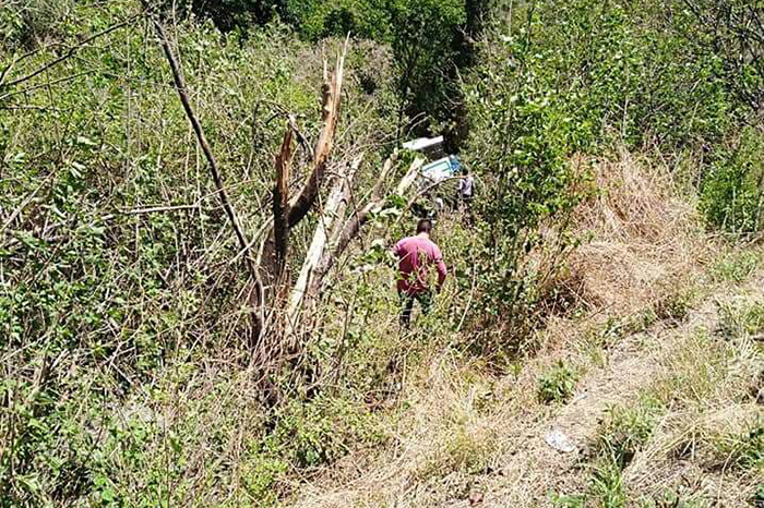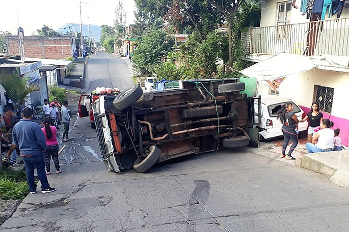 Camión abarrotero vuelca; dos pasajeros quedan lesionados
