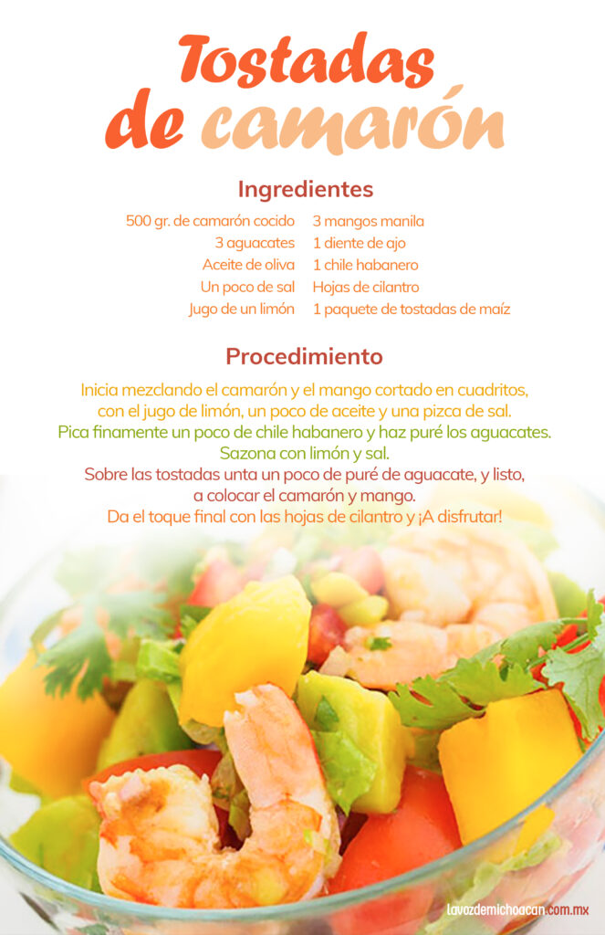 Redacción / La Voz de Michoacán Morelia, Michoacán. Habrá días que prefieras salir rápido de la cocina y este platillo es el perfecto para eso, además vendrá muy bien en esta temporada de altas temperaturas: las tostadas de camarón. Quizá por la cuarentena o simplemente de manera habitual eres el chef de tu hogar, por lo que en La Voz de Michoacán nos hemos dado a la tarea de compartirte varias recetas. Las tostadas de camarón son uno de los platillos más buscados en esta temporada, y que mejor que saber un poco más de éste y tener la receta a la mano. Aunque hay diversas versiones del origen de este platillo, en todas se coincide que desde hace por lo menos dos siglos se come, y fueron cocineros costeños los que comenzaron a experimentar con el crustáceo, para dar origen a las tostadas de camarón. Hay muchas formas de prepararlas, y los ingredientes pueden variar de acuerdo a la región, pero aquí te compartimos una de las recetas que garantiza gustar a la mayoría de los paladares. Entre 6 y 8 unidades podrían salir con esta receta, por lo que si consideras que comerán más de 3 personas te recomendamos que aumentes las cantidades en los ingredientes. En la mesa suelen estar presentes diversas salsas picantes, así como salsa catsup, que pueden dar un toque especial a tus tostadas. Una buena limonada, naranjada y porqué no una cerveza, pueden acompañar muy bien tu tostada de camarones, ¡Provecho! Diseño: Elizabeth Zavala / La Voz de Michoacán.